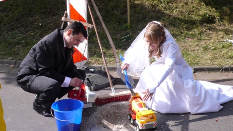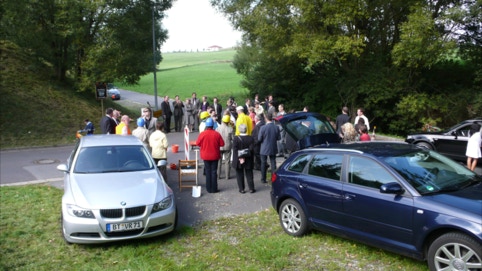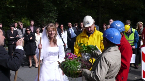 Auch wenn im Vorfeld alles streng geheim war, die Feier war im Gärtlas und wir haben gut recherchiert. Letztendlich ist uns auch in diesem Fall hoffentlich eine kleine Überraschung gelungen und wir konnten unseren GLÜCKwünschen einen geeigneten Rahmen schaffen. Wir wollen uns ja ein paar Jahre in Erinnerung halten. So haben wir weder Zeit noch Aufwand gescheut und uns direkt vor der Auffahrt zum Hügel (am Gasthaus natürlich) der großen Feier postiert. Weder Autos der Fußballspieler noch die mitleidigen Blicke der Passanten störten uns. Eine richtige Bausstelle sollte es für unseren Bauleiter Thorsten sein und für die frisch promovierte Uli haben wir natürlich auch an ein paar Weiden in direkter Nähe gedacht. So einen Platz muss man erst mal finden! Klaus hat keine Mühen gescheut und sogar ein Umleitungsschild besorgt. Einige Autolenke waren von unserem Auftreten sehr beeindruckt und kehrten prompt wieder um. Unser Erscheinungsbild in den echten Bauhelmen war auch professionell. Eine Ladung Schotter wurde als Hindernis aufgebaut und musste geräumt werden. Ohne Fleiß keine Feier oder so ähnlich. Reichlich Werkzeug oder auch Spielzeug stand für die Räumung des Hindernisses zur Verfügung. Zur Stärkung gab es Sekt und wir denken, dass es allen Gästen gefallen hat. Dem Brautpaar wünschen wir an dieser Stelle noch alles alles GUTE, denn an GLÜCK fehlt's ja sowieso nicht. Und wenn Ihr mal wieder in der Heimat seid, dürft Ihr uns auch gerne mal wieder beim Wandern begleiten.