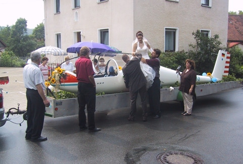 Leider konnten wir der Braut auch nicht ersparen, dem Flieger wieder zu entsteigen. Alles anhalten, aussteigen oder besser herausklettern und die Straße absichern. Polizei war ja genug vertreten, aber die haben sich bis auf einen Rest von "Funkstreife ISAR 12" (das Original) zivil verkleidet. Richard musste daher mit seiner Warnweste einspringen. Das Brautpaar musste sich die Feier verdienen und durfte je drei Schub in die Vollen schmeißen. Die bessere Figur machte eindeutig Julia. Ihre professionelle Körperhaltung deutet auf Kegelblut in ihren Adern. Trotzdem war Alexander letztendlich doch der Sieger des kleinen Vergleichskampfes. Sorry Alex, aber am Anlauf vor dem Schub gibt es noch gewaltig Verbesserungsbedarf. Zum Abschied gab es für alle Zuschauer und natürlich auch für uns reichlich Sekt und die Gäste verpassten auch nicht den Kaffeetisch in Spies.