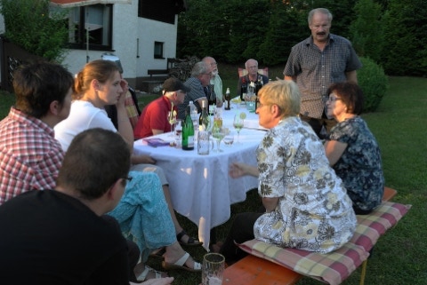 Nach der langen Dürrezeit schmeckte das Bier vom kühlen Fass (Büchenbach) besonders gut. Salate und Fleisch wurden mitgebracht und die Familie S. verwöhnte uns mit einem schönen Abend im Garten. Am runden oder eckigen Tisch, es gab wieder viel zu plaudern. Bei uns ist es halt doch am schönsten. Danke Rita und Heinz im Namen aller Glückkegler.