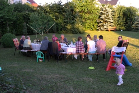 Es gab eine neue Auflage des schon legendären Laternenfestes auf dem Zipser Berg, danke für die Einladung. Fast hätte uns eine Gewitterwolke den Spaß noch verdorben und wir mussten das Essen kurz unterbrechen. Gleich darauf wurde vor allem der Mut der Gastgeber mit einem herrlichen Sommerabend belohnt. Wir dankten mit fast vollzähligem Erscheinen und guter Laune und anständigen Verhalten, auch wenn der abschließend fotografierte Tisch etwas anderes vermuten ließ.. Besonderer Dank gilt noch dem angeheuerten Grillmeister Sebastian, der jederzeit alles fest im Griff hatte und die mitgebrachten Delikatessen je nach individuellen Wünschen garte.